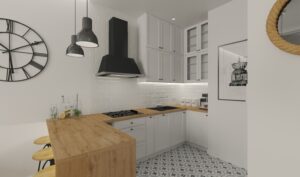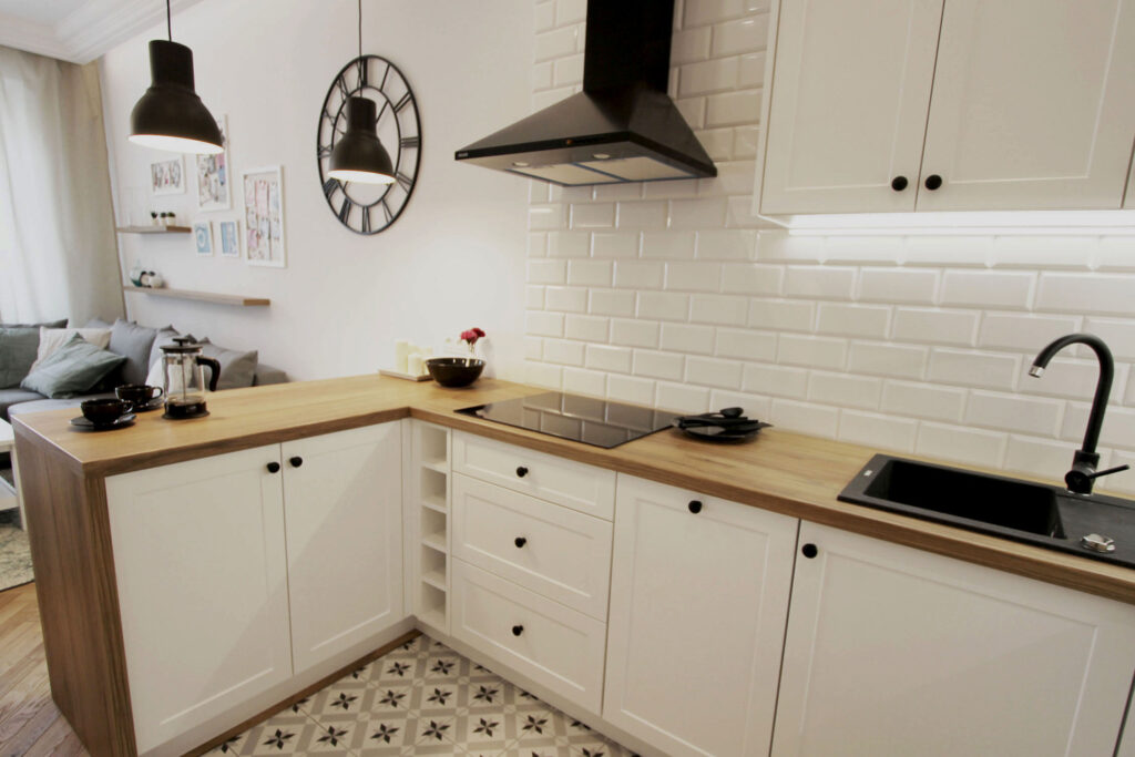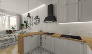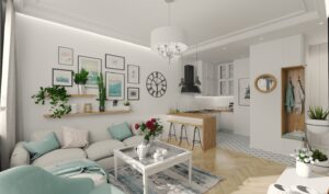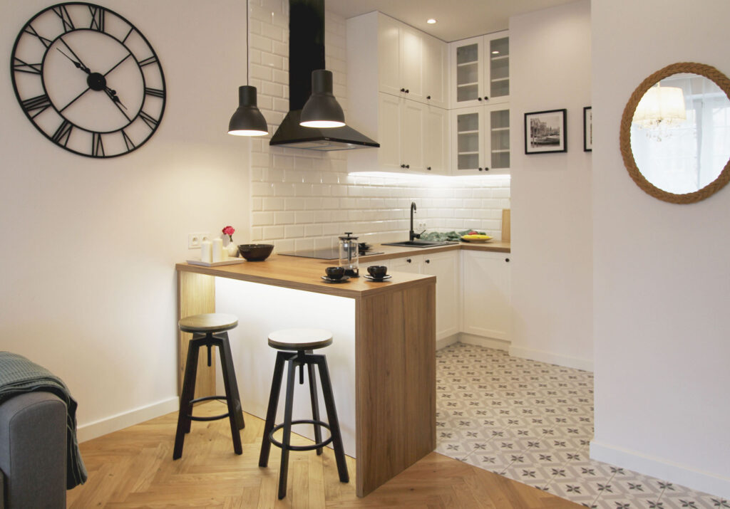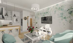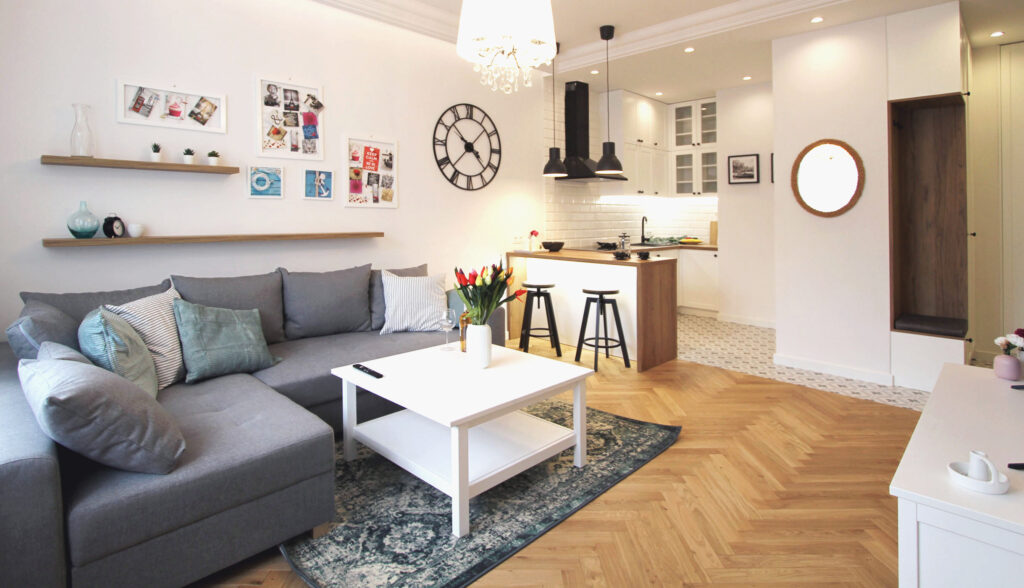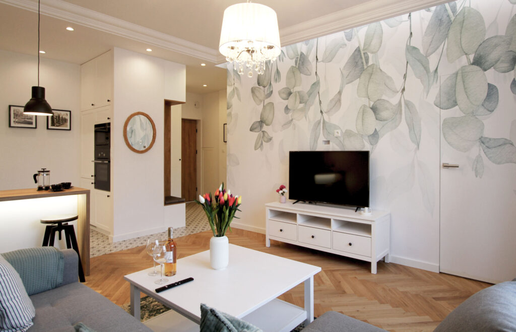 Przytulne mieszkanie składające się z pokoju dziennego z aneksem kuchennym, gdzie dominuje biel i drewno nadając przestrzeni eleganckiego wykończenia.