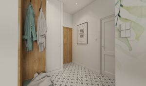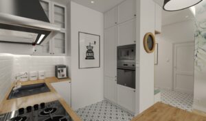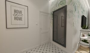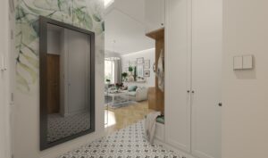 Mieszkanie znajduje się w zabytkowej kamienicy na ulicy Kazimierzowskej w Warszawie. Zaprojektowane wnętrze o powierzchni prawie 42 metrów kwadratowych to połączenie tradycyjnych motywów i nowoczesnych rozwiązań. Wykorzystując jasne kolory w połączeniu z szarościami i dodatkami beżu uzyskaliśmy jasne, przytulne wnętrze. Duże okna zapewniają dostęp światła dziennego i widoki na otoczenie, co sprawia, że wnętrze wydaje się bardziej przestronne i jasne. Mieszkanie składa się z salonu połączonego aneksem kuchennym oraz łazienki i sypialni.